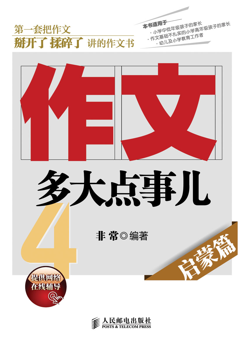 《作文,多大点事儿——启蒙篇》是“作文,多大点事儿”系列的第4本。《作文,多大点事儿——启蒙篇》不是为了帮助孩子直接进入作文的大雅之堂,而是针对正...
